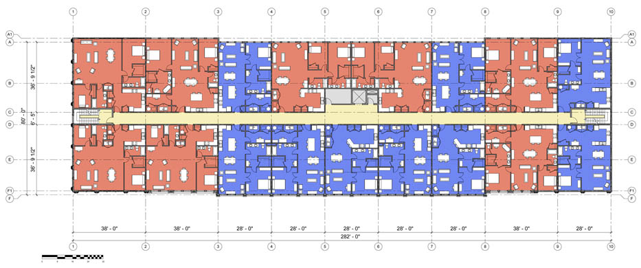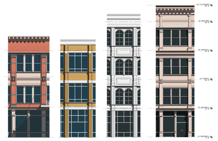 I began by laying out an efficient floor plan of one and two-bedroom units. Through site visits to local cast iron buildings and a trip to Lower Manhattan to see the beauty of these buildings I was able to better understand the client's vision.